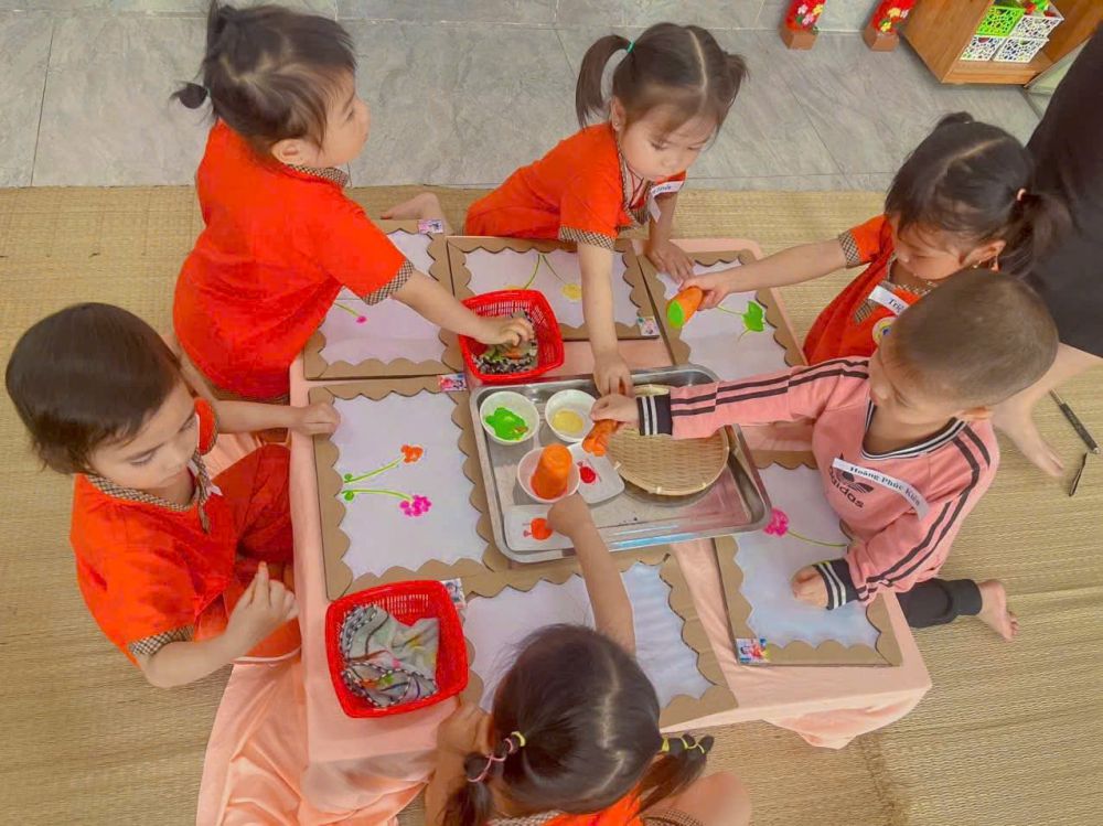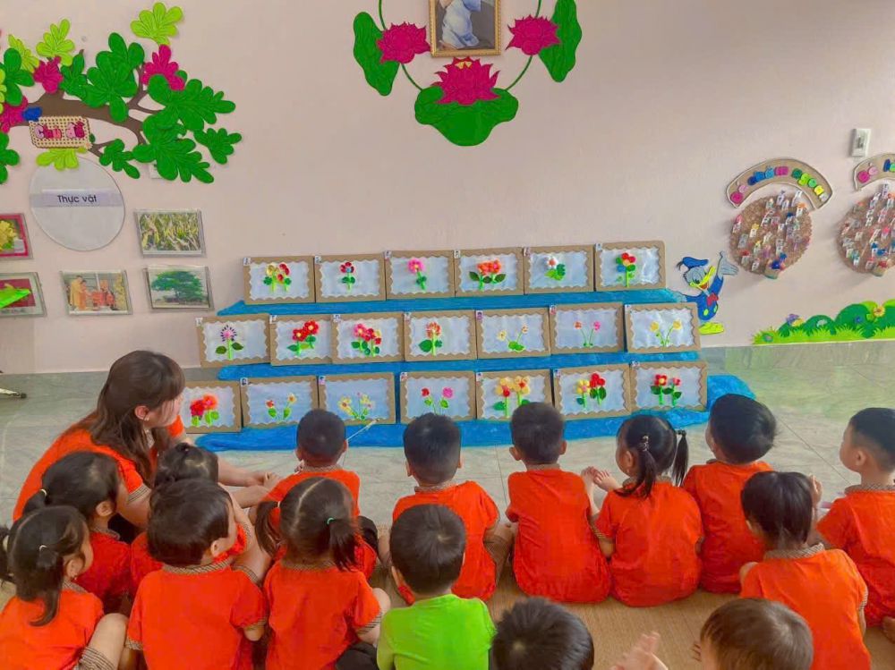 🌼 Hoạt động được chuẩn bị chu đáo, sử dụng học liệu trực quan, gần gũi, phù hợp với lứa tuổi. 2 tổ chuyên môn mỗi tổ thực hiện 1 tiết dạy: Cô giáo Trần Thanh Thủy thực hiện đề tài “Tạo hình bông hoa bằng các nguyên vật liệu” Cô giáo Hoàng Thị Miên thực hiện hoạt động âm nhạc, đề tài dạy vận động vỗ tay theo tiết tấu chậm “ Em đi qua ngã tư đường phố”