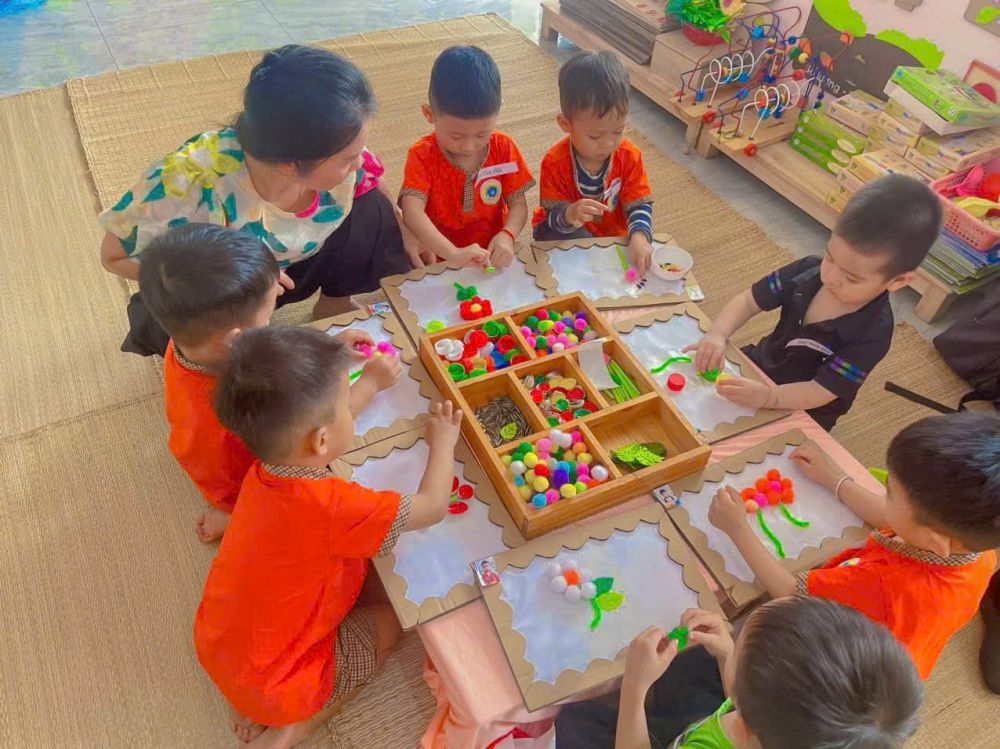 Hình ảnh: Các bé lớp 3-4 tuổi TT thực hiện hoạt động tạo hình bông hoa bằng các nguyên vật liệu